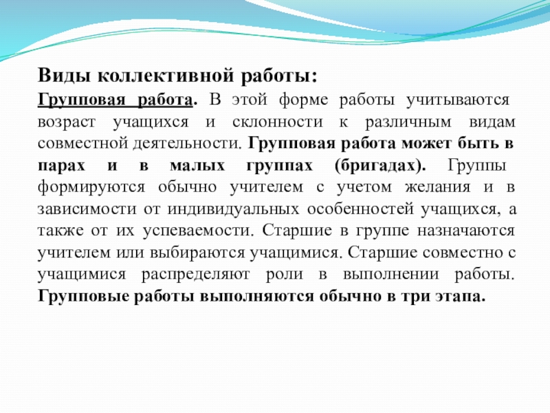 и склонности к различным видам совместной деятельности. Групповая работа может быть в парах и в малых группах (бригадах). Группы формируются обычно учителем с учетом желания и в зависимости от индивидуальных особенностей учащихся, а также от их успеваемости. Старшие в группе назначаются учителем или выбираются учащимися. Старшие совместно с учащимися распределяют роли в выполнении работы. Групповые работы выполняются обычно в три этапа.