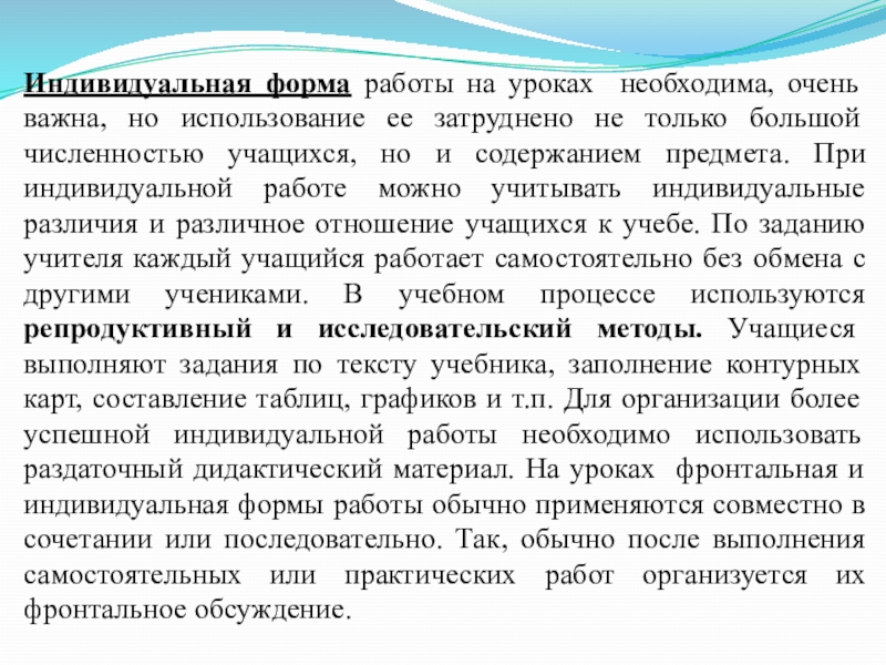 затруднено не только большой численностью учащихся, но и содержанием предмета. При индивидуальной работе можно учитывать индивидуальные различия и различное отношение учащихся к учебе. По заданию учителя каждый учащийся работает самостоятельно без обмена с другими учениками. В учебном процессе используются репродуктивный и исследовательский методы. Учащиеся выполняют задания по тексту учебника, заполнение контурных карт, составление таблиц, графиков и т.п. Для организации более успешной индивидуальной работы необходимо использовать раздаточный дидактический материал. На уроках фронтальная и индивидуальная формы работы обычно применяются совместно в сочетании или последовательно. Так, обычно после выполнения самостоятельных или практических работ организуется их фронтальное обсуждение.