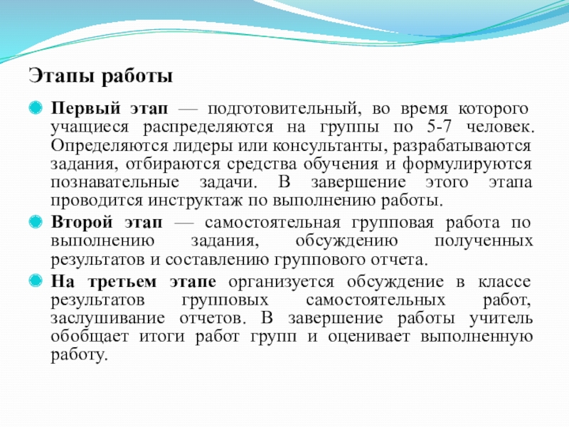 группы по 5-7 человек. Определяются лидеры или консультанты, разрабатываются задания, отбираются средства обучения и формулируются познавательные задачи. В завершение этого этапа проводится инструктаж по выполнению работы.
