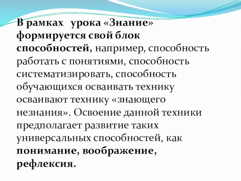 Слайд 19В рамках урока «Знание» формируется свой блок способностей, например, способность