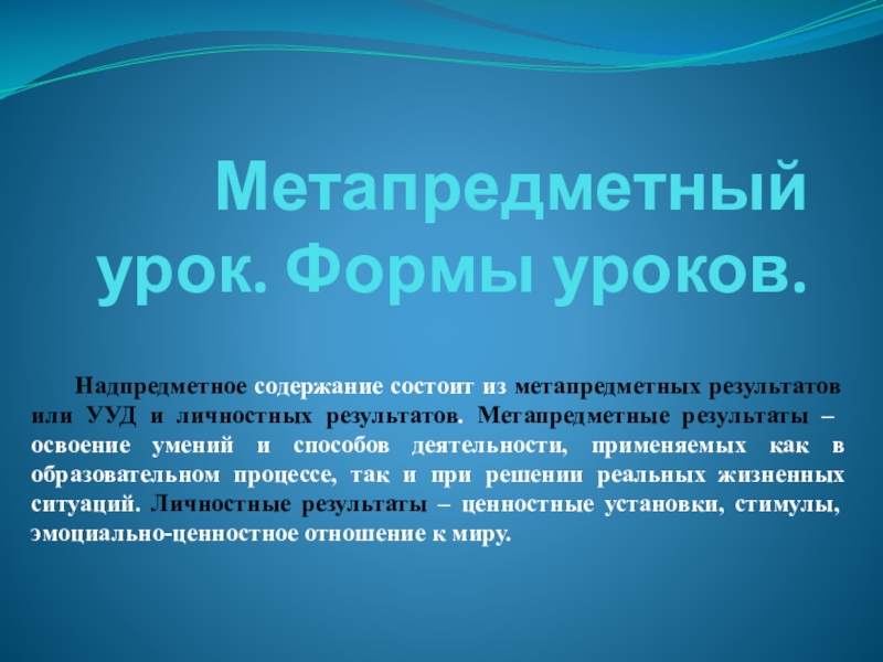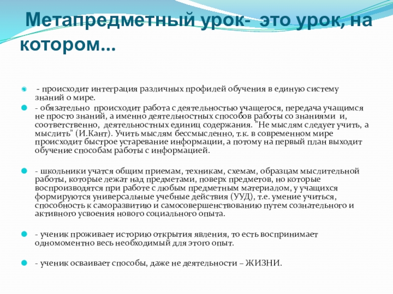 Метапредметный урок- применение метапредметных и универсальных учебных действий в связи с жизненными потребностями. На метапредметном уроке должны формироваться универсальные действия, необходимые для процесса познания в принципе.