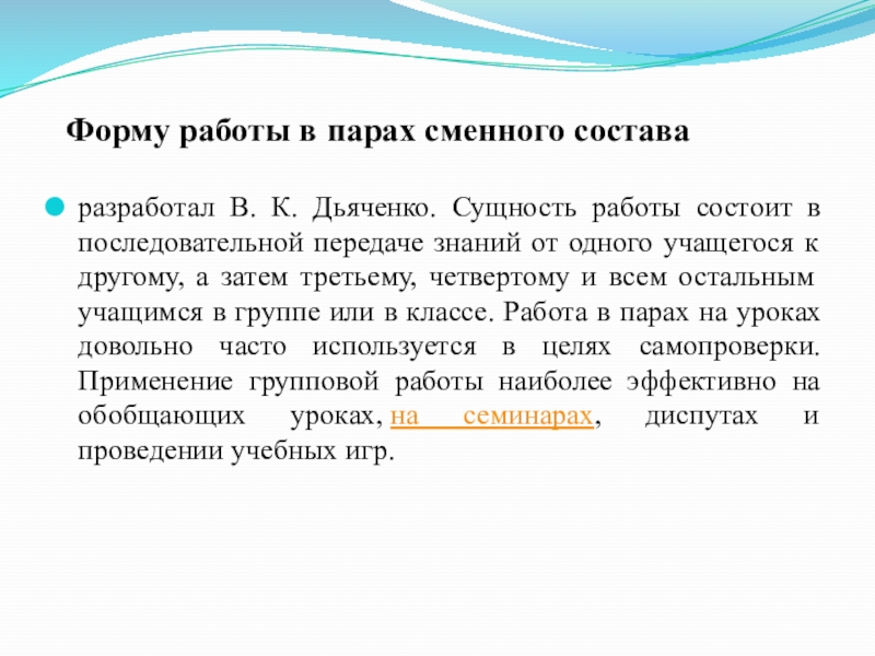 работы состоит в последовательной передаче знаний от одного учащегося к другому, а затем третьему, четвертому и всем остальным учащимся в группе или в классе. Работа в парах на уроках довольно часто используется в целях самопроверки. Применение групповой работы наиболее эффективно на обобщающих уроках, на семинарах, диспутах и проведении учебных игр.