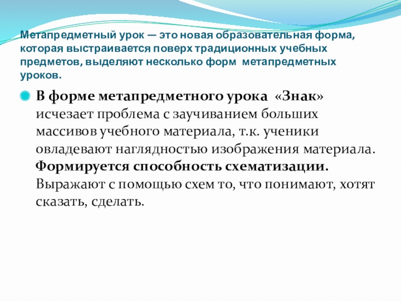 В форме метапредметного урока «Знак» исчезает проблема с заучиванием больших массивов учебного материала, т.к. ученики овладевают наглядностью изображения материала. Формируется способность схематизации. Выражают с помощью схем то, что понимают, хотят сказать, сделать.