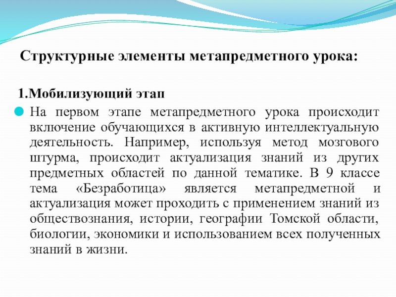 включение обучающихся в активную интеллектуальную деятельность. Например, используя метод мозгового штурма, происходит актуализация знаний из других предметных областей по данной тематике. В 9 классе тема «Безработица» является метапредметной и актуализация может проходить с применением знаний из обществознания, истории, географии Томской области, биологии, экономики и использованием всех полученных знаний в жизни.