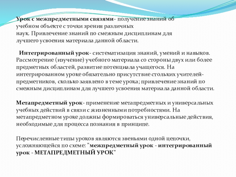 Перечисленные типы уроков являются звеньями одной цепочки, усложняющейся по схеме: "межпредметный урок - интегрированный урок - МЕТАПРЕДМЕТНЫЙ УРОК"