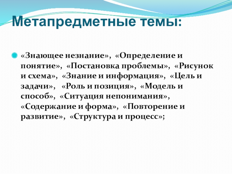 какой-то конкретной организованности (знания, знака, проблемы, задачи), которая надпредметна и носит универсальный характер (отсюда и название метапредметов – метапредмет "Знание", метапредмет "Знак", метапредмет "Проблема", метапредмет "Задача");