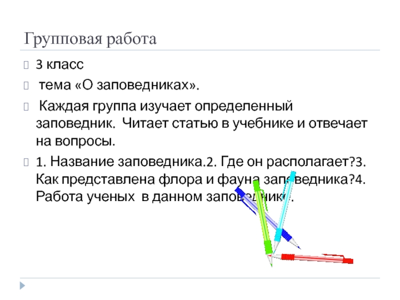 Групповая работа3 класс тема «О заповедниках». Каждая группа изучает определенный заповедник. Читает статью в учебнике и отвечает