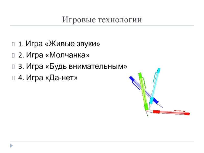Игровые технологии1. Игра «Живые звуки»2. Игра «Молчанка»3. Игра «Будь внимательным»4. Игра «Да-нет»