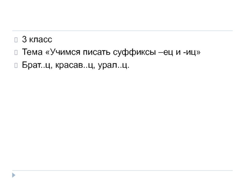 3 классТема «Учимся писать суффиксы –ец и -иц»Брат..ц, красав..ц, урал..ц.