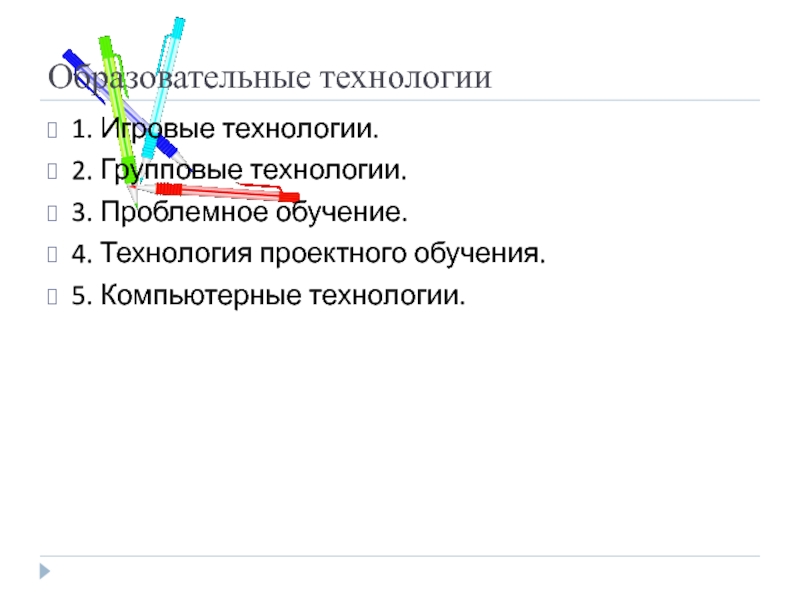 Образовательные технологии1. Игровые технологии.2. Групповые технологии.3. Проблемное обучение.4. Технология проектного обучения.5. Компьютерные технологии.