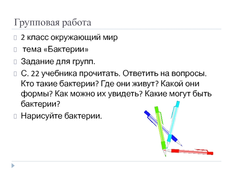 Групповая работа2 класс окружающий мир тема «Бактерии»Задание для групп.С. 22 учебника прочитать. Ответить на вопросы. Кто такие