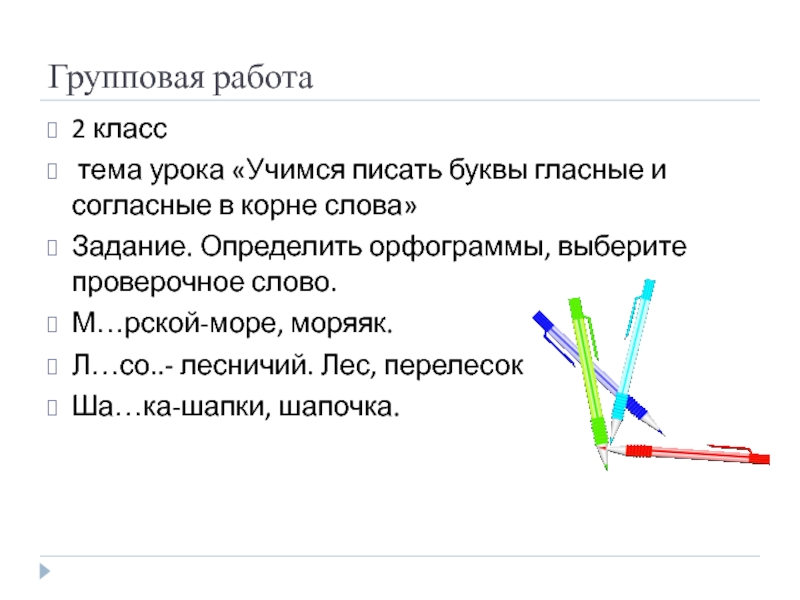 Групповая работа2 класс тема урока «Учимся писать буквы гласные и согласные в корне слова» Задание. Определить орфограммы,