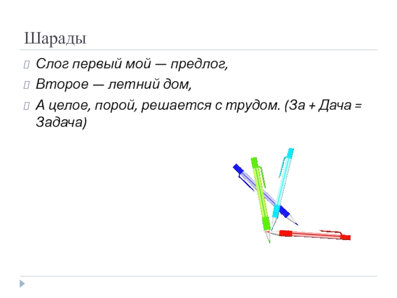 ШарадыСлог первый мой — предлог, Второе — летний дом,А целое, порой, решается с трудом. (За + Дача