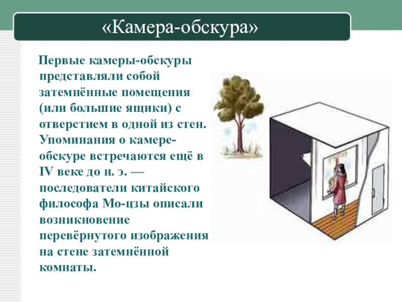 ящики) с отверстием в одной из стен. Упоминания о камере-обскуре встречаются ещё в IV веке до н. э. — последователи китайского философа Мо-цзы описали возникновение перевёрнутого изображения на стене затемнённой комнаты.