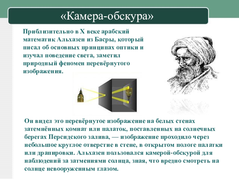 затемнённых комнат или палаток, поставленных на солнечных берегах Персидского залива, — изображение проходило через небольшое круглое отверстие в стене, в открытом пологе палатки или драпировки. Альхазен пользовался камерой-обскурой для наблюдений за затмениями солнца, зная, что вредно смотреть на солнце невооруженным глазом.