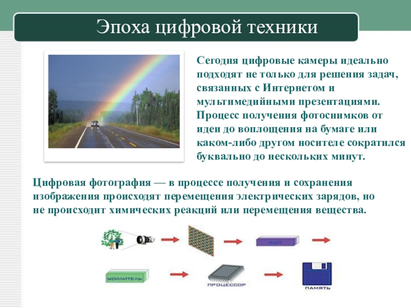 Цифровая фотография — в процессе получения и сохранения изображения происходят перемещения электрических зарядов, но не происходит химических реакций или перемещения вещества.