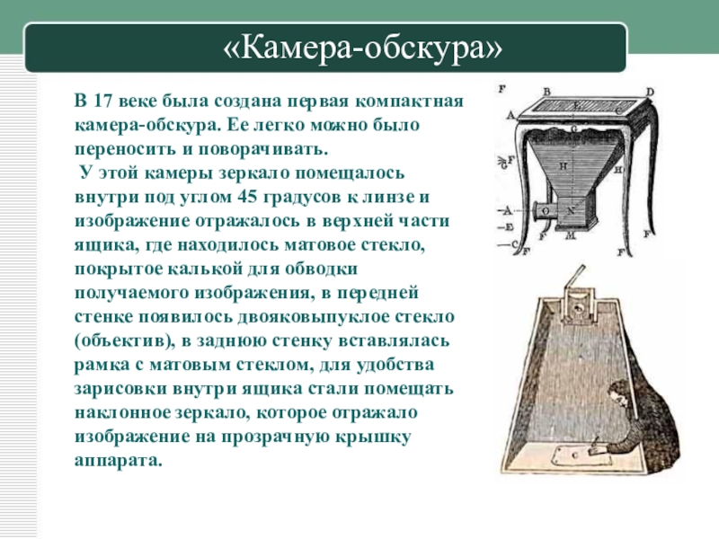 В 17 веке была создана первая компактная камера-обскура. Ее легко можно