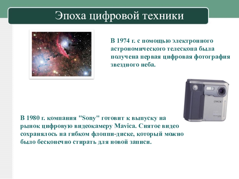В 1980 г. компания "Sony" готовит к выпуску на рынок цифровую видеокамеру Mavica. Снятое видео сохранялось на гибком флоппи-диске, который можно было бесконечно стирать для новой записи.