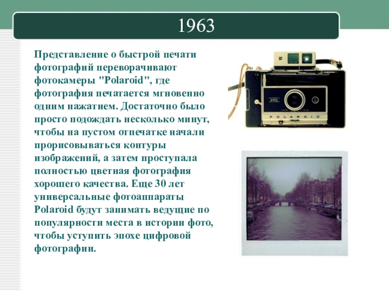 мгновенно одним нажатием. Достаточно было просто подождать несколько минут, чтобы на пустом отпечатке начали прорисовываться контуры изображений, а затем проступала полностью цветная фотография хорошего качества. Еще 30 лет универсальные фотоаппараты Polaroid будут занимать ведущие по популярности места в истории фото, чтобы уступить эпохе цифровой фотографии.