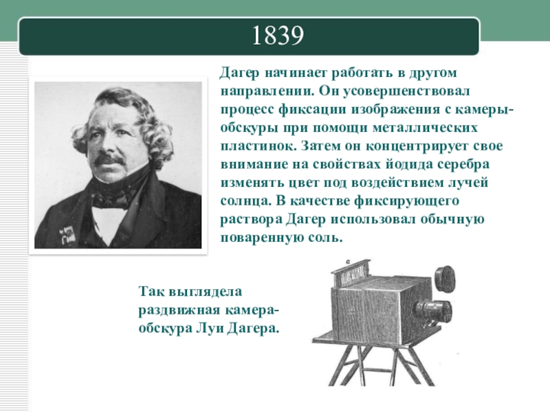 с камеры-обскуры при помощи металлических пластинок. Затем он концентрирует свое внимание на свойствах йодида серебра изменять цвет под воздействием лучей солнца. В качестве фиксирующего раствора Дагер использовал обычную поваренную соль.