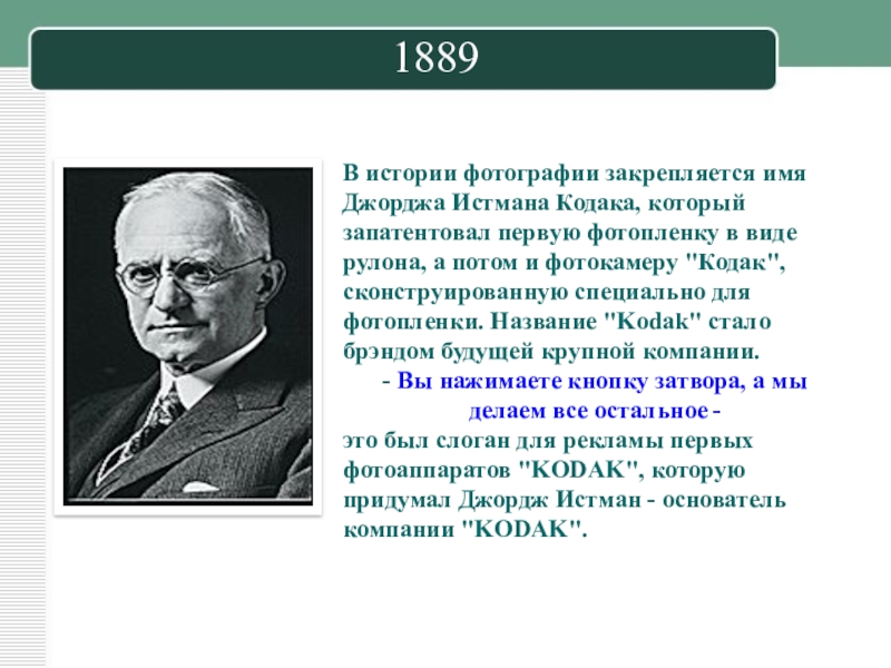 фотопленку в виде рулона, а потом и фотокамеру "Кодак", сконструированную специально для фотопленки. Название "Kodak" стало брэндом будущей крупной компании.