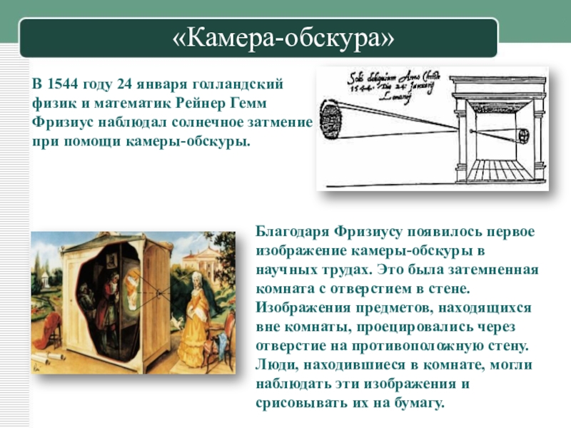 Фризиус наблюдал солнечное затмение при помощи камеры-обскуры.