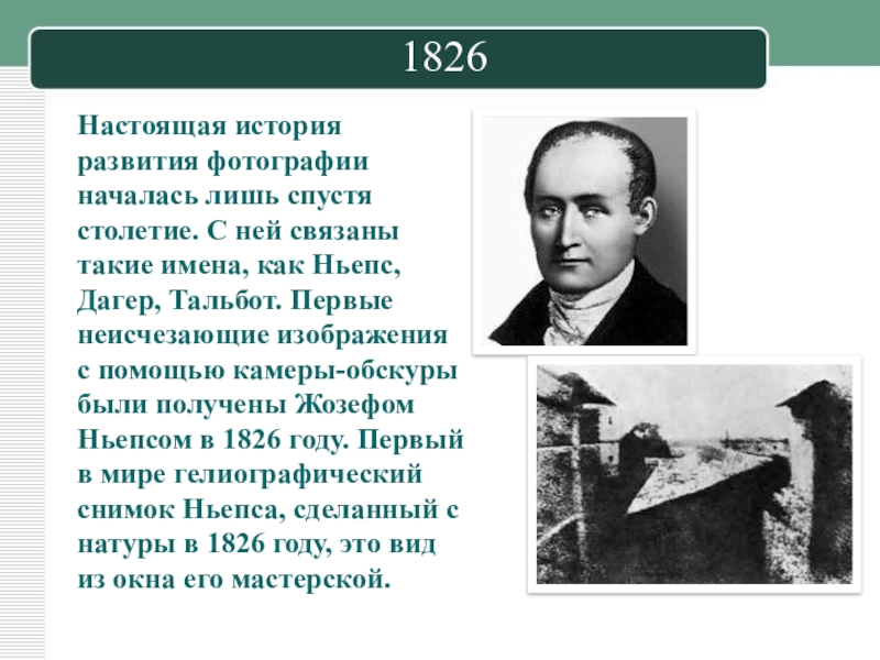 такие имена, как Ньепс, Дагер, Тальбот. Первые неисчезающие изображения с помощью камеры-обскуры были получены Жозефом Ньепсом в 1826 году. Первый в мире гелиографический снимок Ньепса, сделанный с натуры в 1826 году, это вид из окна его мастерской.