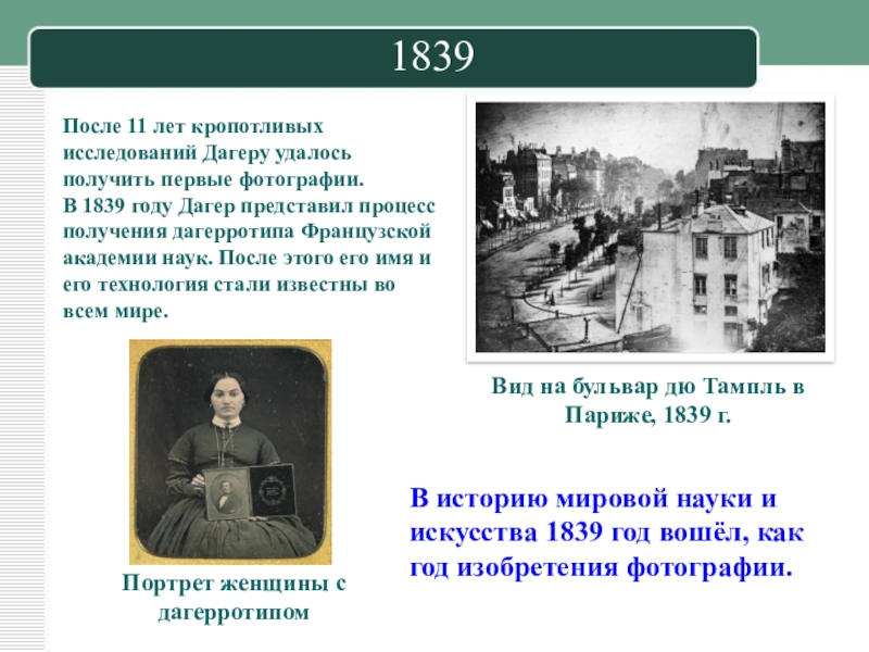 В 1839 году Дагер представил процесс получения дагерротипа Французской академии наук. После этого его имя и его технология стали известны во всем мире.