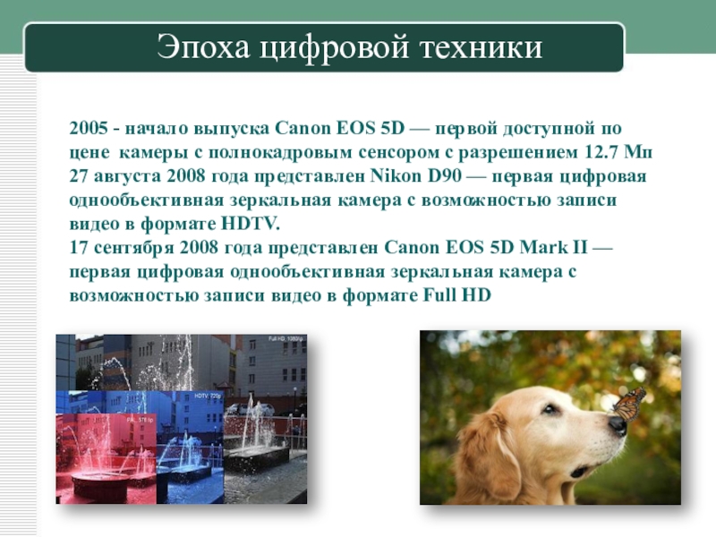 17 сентября 2008 года представлен Canon EOS 5D Mark II — первая цифровая однообъективная зеркальная камера с возможностью записи видео в формате Full HD