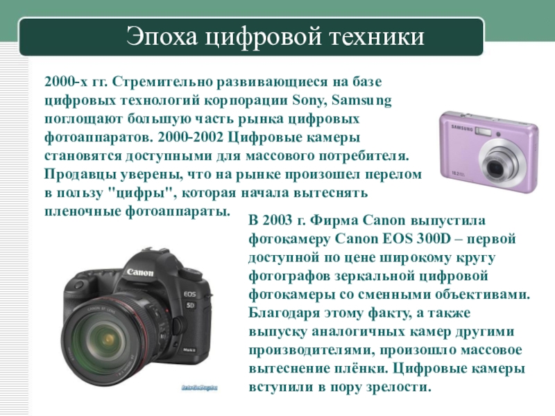 В 2003 г. Фирма Canon выпустила фотокамеру Canon EOS 300D – первой доступной по цене широкому кругу фотографов зеркальной цифровой фотокамеры со сменными объективами. Благодаря этому факту, а также выпуску аналогичных камер другими производителями, произошло массовое вытеснение плёнки. Цифровые камеры вступили в пору зрелости.