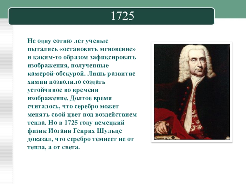 зафиксировать изображения, полученные камерой-обскурой. Лишь развитие химии позволило создать устойчивое во времени изображение. Долгое время считалось, что серебро может менять свой цвет под воздействием тепла. Но в 1725 году немецкий физик Иоганн Генрих Шульце доказал, что серебро темнеет не от тепла, а от света.
