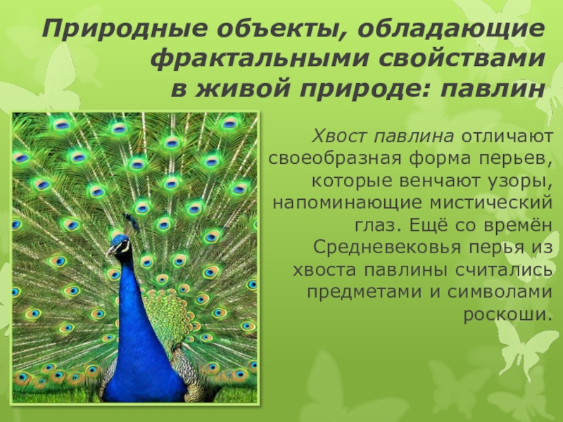 павлина отличают своеобразная форма перьев, которые венчают узоры, напоминающие мистический глаз. Ещё со времён Средневековья перья из хвоста павлины считались предметами и символами роскоши.