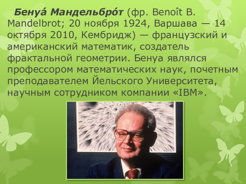 Слайд 4 Бенуа́ Мандельбро́т (фр. Benoît B. Mandelbrot; 20 ноября 1924, Варшава