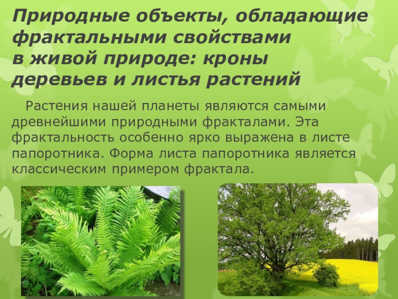 Растения нашей планеты являются самыми древнейшими природными фракталами. Эта фрактальность особенно ярко выражена в листе папоротника. Форма листа папоротника является классическим примером фрактала.