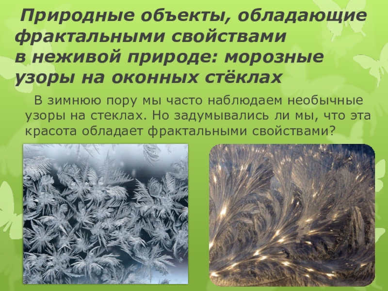 В зимнюю пору мы часто наблюдаем необычные узоры на стеклах. Но задумывались ли мы, что эта красота обладает фрактальными свойствами?