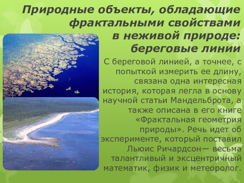 Слайд 12Природные объекты, обладающие фрактальными свойствами