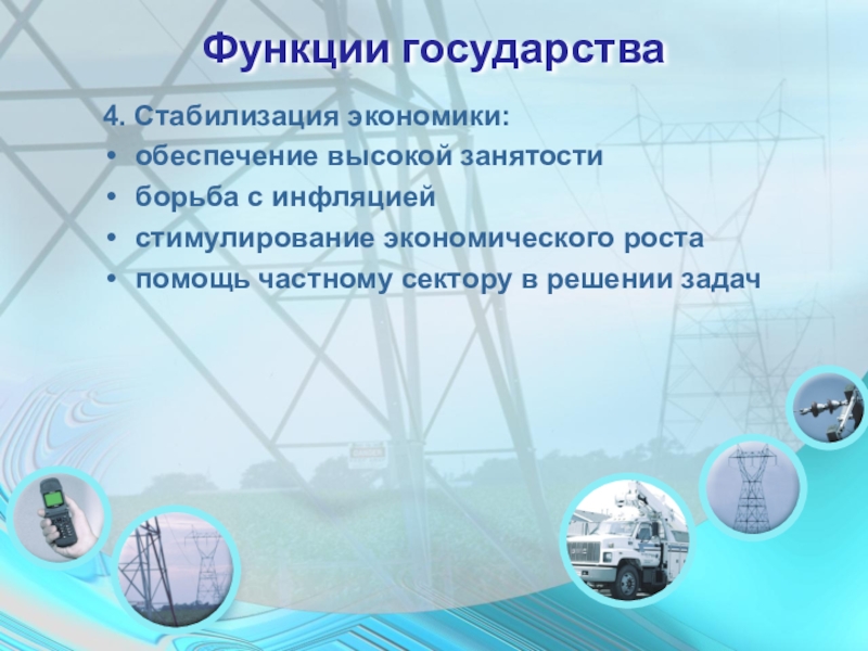 Функции государства4. Стабилизация экономики:обеспечение высокой занятостиборьба с инфляциейстимулирование экономического ростапомощь частному сектору в решении задач