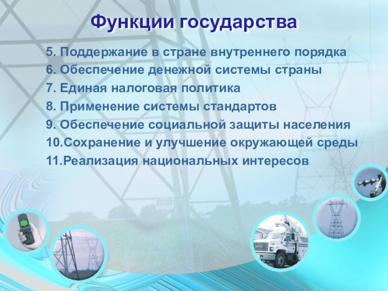 Функции государства5. Поддержание в стране внутреннего порядка6. Обеспечение денежной системы страны7. Единая налоговая политика8. Применение системы стандартов9.