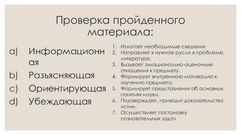 Проверка пройденного материала: ИнформационнаяРазъясняющаяОриентирующаяУбеждающаяИзлагает необходимые сведения.Направляет в нужное русло в проблеме, литературе. Вызывает эмоционально-оценочные отношения к предмету.Формирует