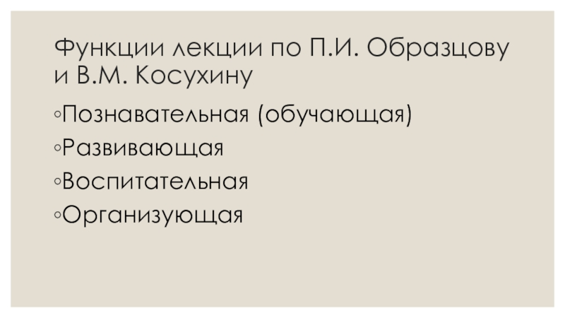 Функции лекции по П.И. Образцову и В.М. Косухину Познавательная (обучающая) РазвивающаяВоспитательнаяОрганизующая