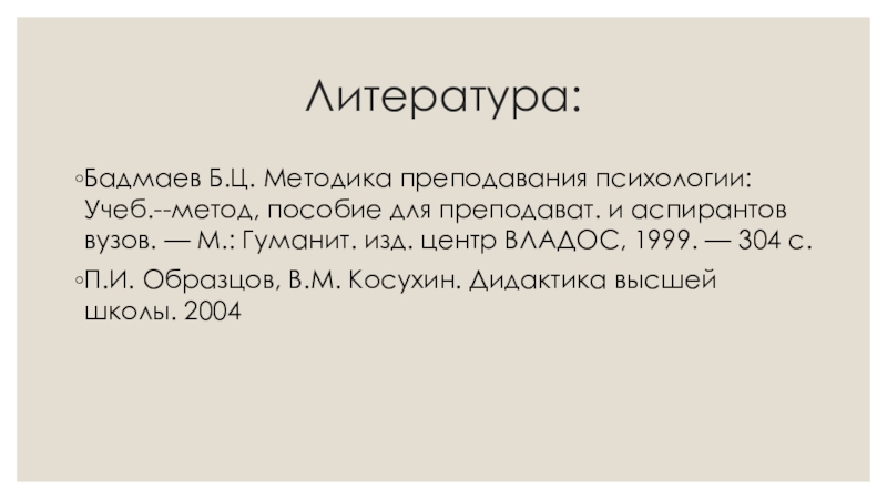 Литература: Бадмаев Б.Ц. Методика преподавания психологии: Учеб.--метод, пособие для преподават. и аспирантов вузов. — М.: Гуманит. изд.