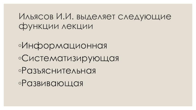 Ильясов И.И. выделяет следующие функции лекцииИнформационнаяСистематизирующаяРазъяснительнаяРазвивающая