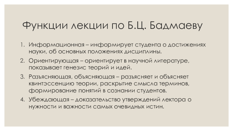 Функции лекции по Б.Ц. Бадмаеву Информационная – информирует студента о достижениях науки, об основных положениях дисциплины.Ориентирующая –