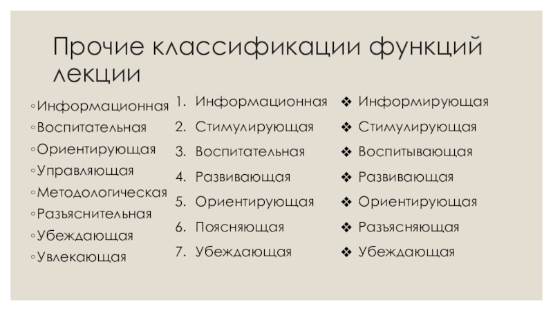 Прочие классификации функций лекцииИнформационнаяВоспитательнаяОриентирующаяУправляющаяМетодологическаяРазъяснительнаяУбеждающаяУвлекающаяИнформационнаяСтимулирующаяВоспитательнаяРазвивающаяОриентирующаяПоясняющаяУбеждающаяИнформирующаяСтимулирующаяВоспитывающаяРазвивающаяОриентирующаяРазъясняющаяУбеждающая