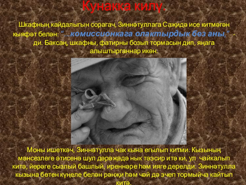 Моны ишеткәч, Зиннәтулла чак кына егылып китми. Кызының мәнсезлеге әтисенә шул дәрәҗәдә нык тәэсир итә ки, ул чайкалып китә, йөрәге сызлый башлый, иреннәре һәм ияге дерелди. Зиннәтулла кызына бөтен күңеле белән рәнҗи һәм чәй дә эчеп тормыйча кайтып китә.