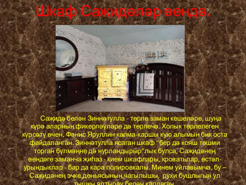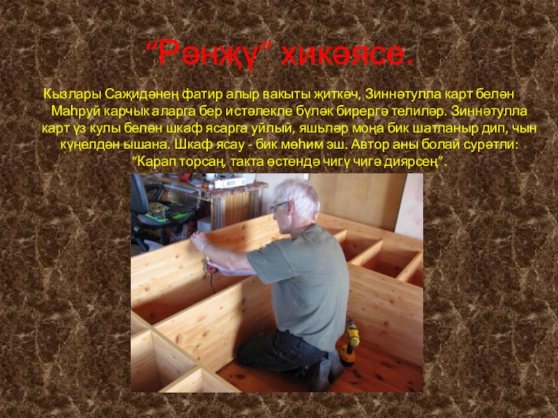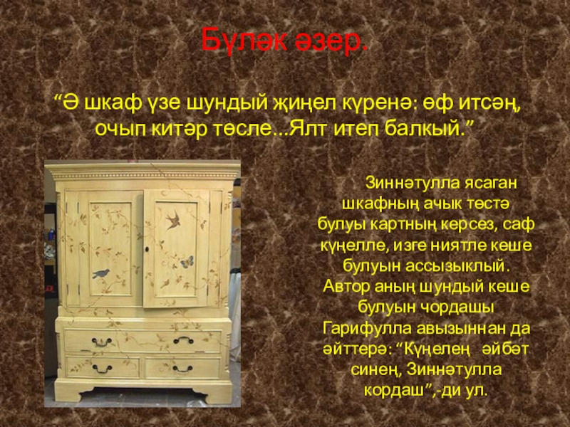 Зиннәтулла ясаган шкафның ачык төстә булуы картның керсез, саф күңелле, изге ниятле кеше булуын ассызыклый. Автор аның шундый кеше булуын чордашы Гарифулла авызыннан да әйттерә: “Күңелең әйбәт синең, Зиннәтулла кордаш”,-ди ул.