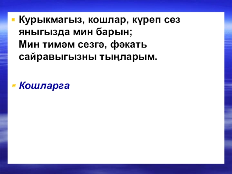 Слайд 12Курыкмагыз, кошлар, күреп сез яныгызда мин барын;