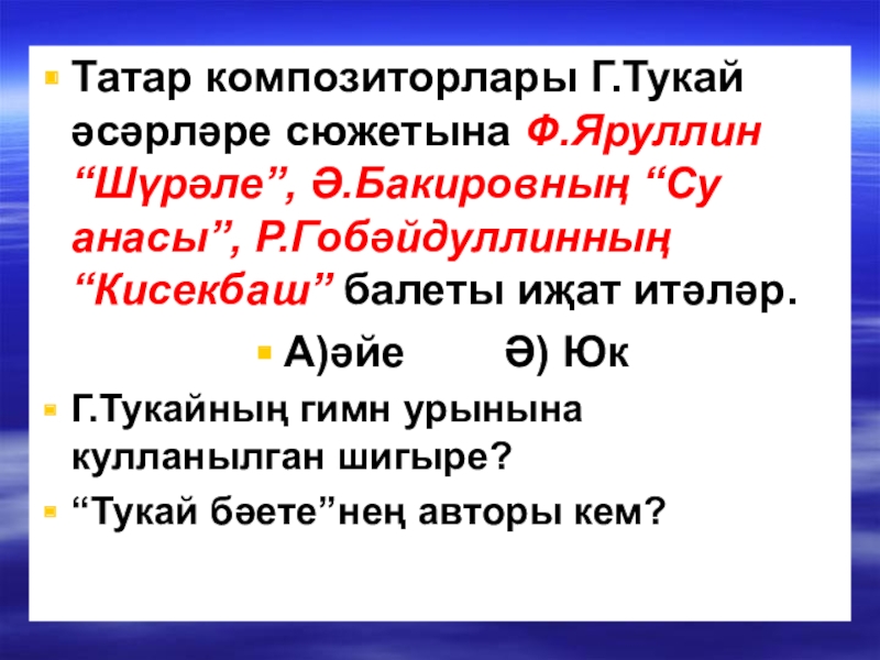 Слайд 17Татар композиторлары Г.Тукай әсәрләре сюжетына Ф.Яруллин “Шүрәле”, Ә.Бакировның “Су анасы”, Р.Гобәйдуллинның