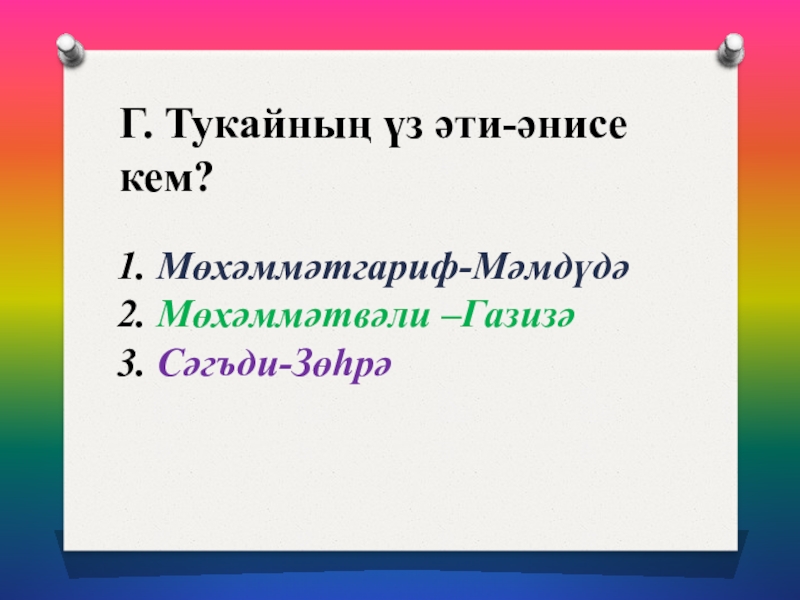 Г. Тукайның үз әти-әнисе кем?1. Мөхәммәтгариф-Мәмдүдә2. Мөхәммәтвәли –Газизә3. Сәгъди-Зөһрә