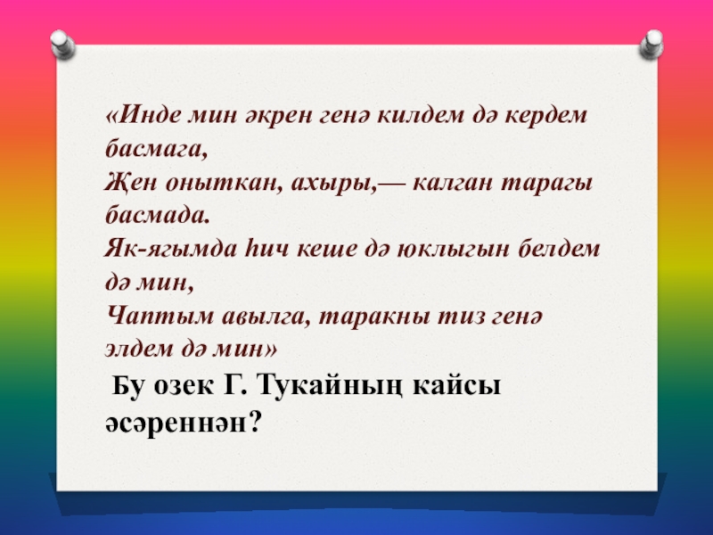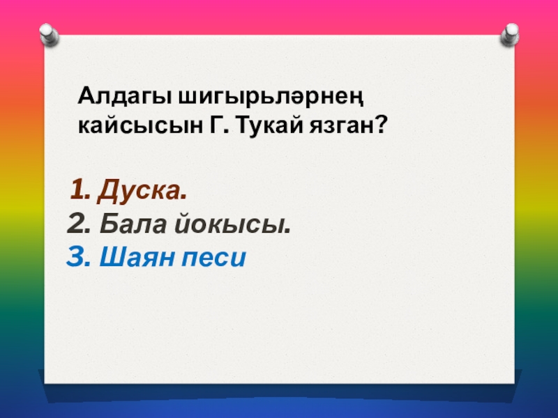 Слайд 9Алдагы шигырьләрнең кайсысын Г. Тукай язган?